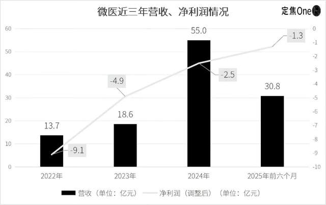 从营收看,微医确实在增长。招股书显示,2022年至2024年,其收入从13.7亿元增到至55.0亿元,年均复合增长率超100%;2025年上半年营收30.8亿元,同比增达幅69.4%。