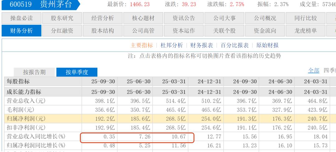 具体到每个季度,营收增长下滑趋势更加明显。前三个季度的营收分别为514.4亿元、396.5亿元和398.1亿元,对应增长分别为10.67%、7.26%和0.35%,可以明显看出茅台的营收增长已经直线下滑。