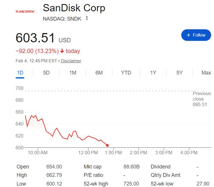 美东时间2月4日周三,三大美股指表现不一,道指反弹,标普早盘转跌,纳指低开低走,显示资金从前期强势的科技板块继续撤离。早盘纳指跌幅扩大到1%以上,存储芯片股跌幅更大,呈现明显的“高位股补跌+资金兑现”的特征。到午盘,闪迪、西部数据、美光科技盘中跌幅均扩大到10%以上,希捷科技跌超9%。