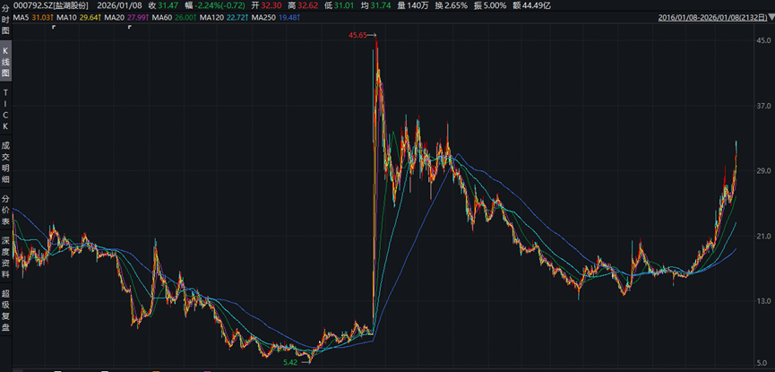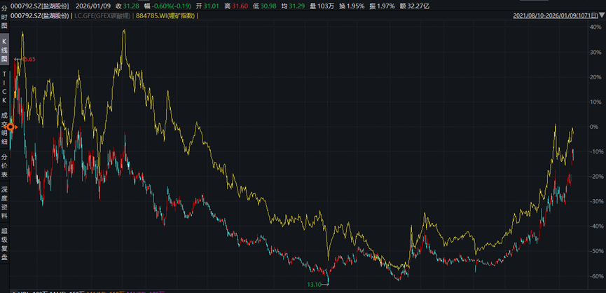 2019年至2021年:2019年4月30日起,公司变更为ST盐湖,2019年9月进入司法重整。2021年8月10日,恢复上市即高峰,与当时的锂价高涨有关。2021年公司股价最高触及45.65元的高位,至今仍未修复。