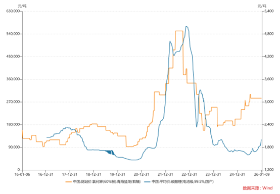 图:碳酸锂及氯化钾价格走势,单位:元/吨