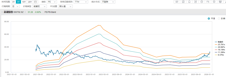 从锂资源优质性来看,天齐及赣锋均以锂矿石为主,单吨成本盐湖约3万元/吨左右,而天齐4.5-6.0万元/吨;赣锋为6.5-8.3万元/吨左右,市净率的差异与资源禀赋的优质性相关联。从PE来看,分化较明显,以2026年1月下旬股价约31.28元计,对应2025年业绩的市盈率(PE)约19.3倍。若以2026年预期PE来看,盐湖股份降至约15.5倍。