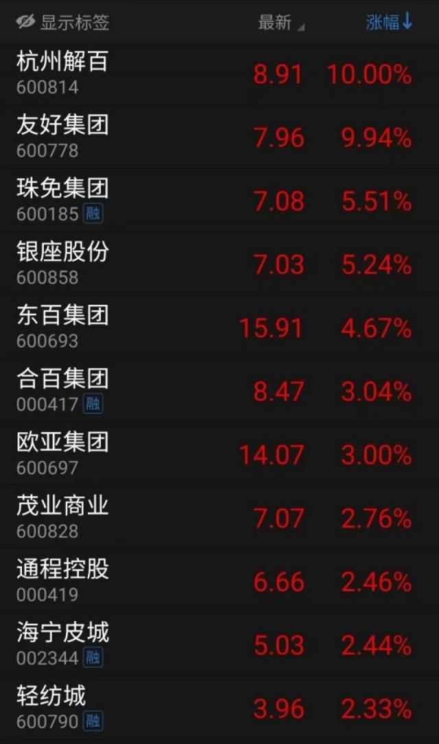 2月4日当天,板块内个股的强势表现进一步延续,除杭州解百涨停外,友好集团股价上涨9.94%,接近涨停,珠免集团、银座股份分别上涨5.51%和5.24%,涨幅位居板块前列。
