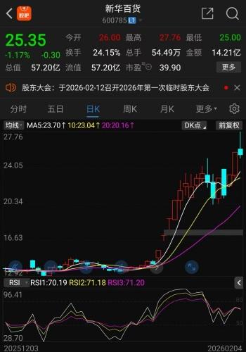 1月14日至1月19日,新华百货连续四个涨停,1月29日和2月2日、3日再度涨停。截至2月4日收盘,新华百货报25.35元/股,今年以来累计上涨87.08%。截至2月4日收盘,新华百货总市值达57.20亿元,当日换手率24.15%,成交金额14.21亿元,资金交易活跃度极高。