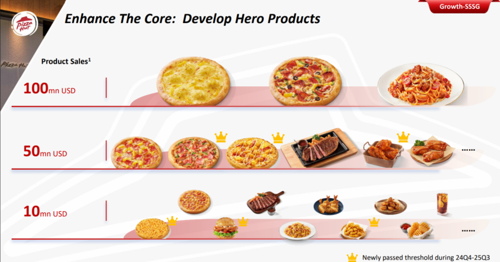不只是肯德基,大单品战略在百胜中国其他品牌也屡试不爽:必胜客榴莲披萨、超级至尊披萨以及意式肉酱面年度单品销售额均超过1亿美元,2025年,必胜客售出超过2亿张披萨。去年11月的投资者日上,拉瓦萨咖啡表示,其招牌产品水牛乳拿铁在过去12个月售出超150万杯,占饮品销量约四分之一。