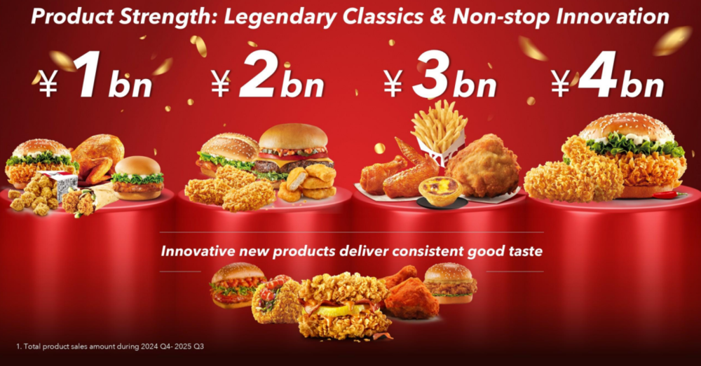 1991年,肯德基推出餐厅手工裹粉、带有黄金鳞片的美式炸鸡香辣鸡翅,12年后,肯德基融汇数十种香料,以高温蒸烤,推出新奥尔良烤翅。这两款当年的新品早已成为肯德基的销售扛把子。根据百胜中国2025年投资者日的相关资料,肯德基新奥尔良烤翅的年度销售额已经超过了30亿,香辣鸡翅更是超过了40亿,充分凸显了大单品的影响力。