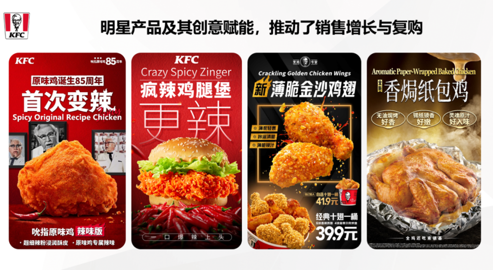 从炸翅、烤翅再到中式翅,从秘汁炸全鸡到香焗纸包鸡,肯德基不仅持续夯实已有品类的优势地位,还不断创造新的爆款品类,聚焦大单品的延伸创新,锁定了消费者的忠诚度,更抬高了品牌的天花板。