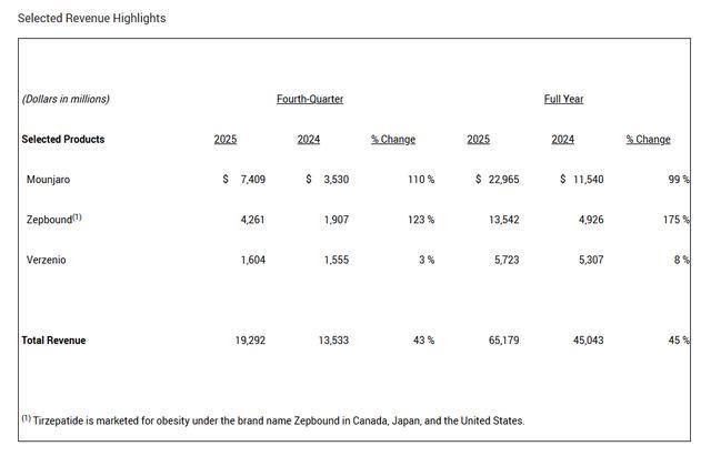 单季度来看,替尔泊肽的增长也相当强势。降糖版替尔泊肽第四季度营收达到74.1亿美元,同比增长110%;减重版替尔泊肽在第四季度实现42.6亿美元的营收,同比增长123%,增长主要由美国市场驱动。