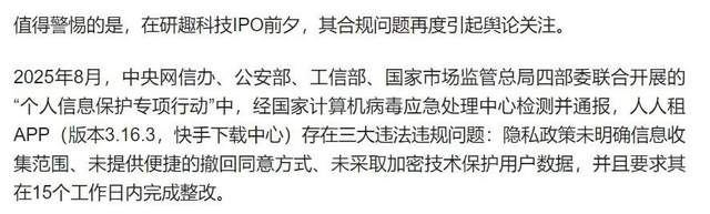 更令人担忧的是数据安全问题。据此前《理财周刊》报道,2025年8月,中央网信办等四部委联合通报人人租APP存在三大违法违规问题:隐私政策未明确信息收集范围、未提供便捷的撤回同意方式、未采取加密技术保护用户数据。