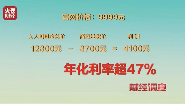 2025年4月,央视财经《财经调查》曝光其黑幕。以官网售价9999元的手机为例,消费者支付12期租金及买断金后,总支出达12798.1元,是官网售价的1.27倍,而商户进货价仅8700元,单台毛利约4100元,对应年化利率超47%。