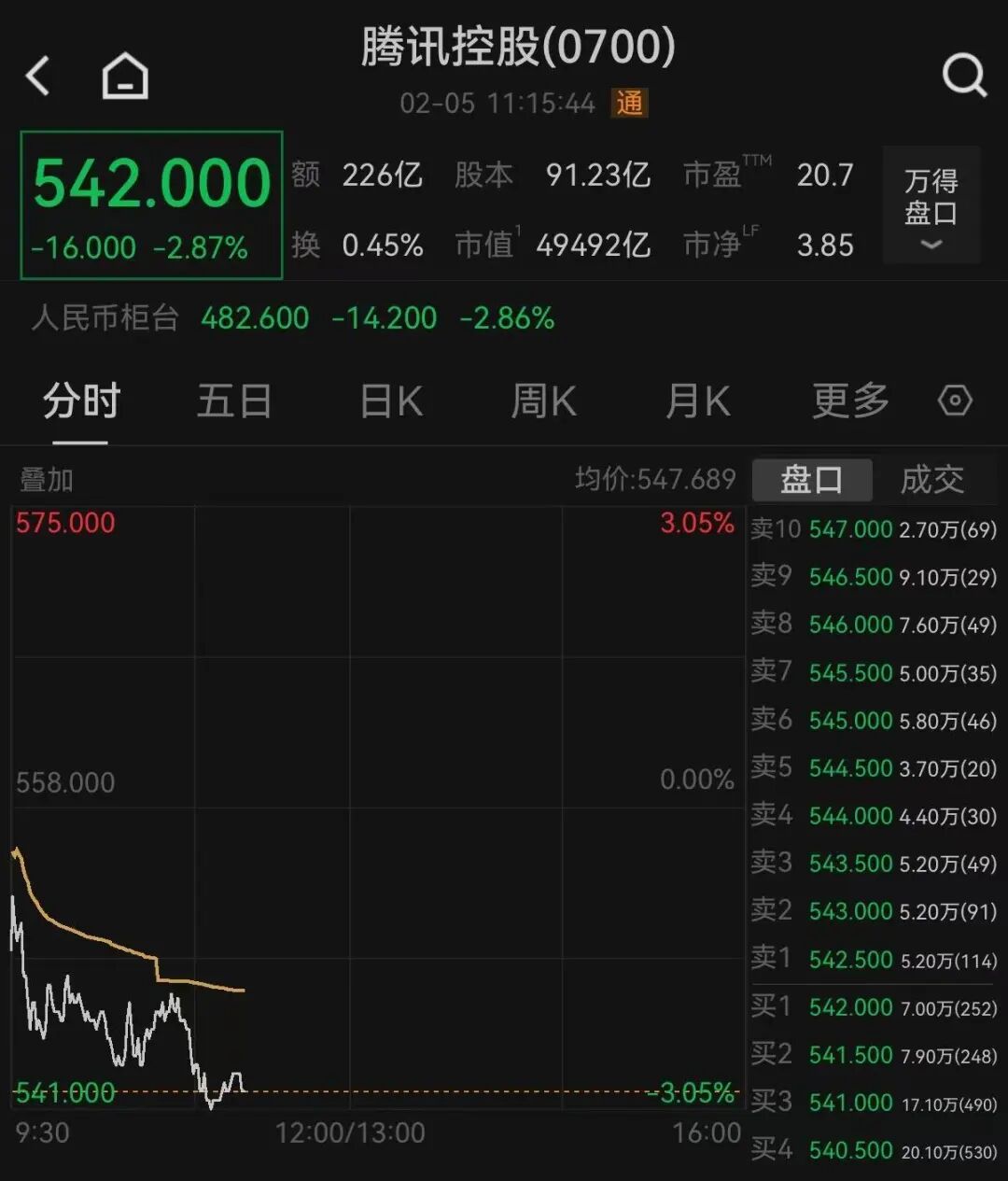 2月5日盘中,腾讯控股股价跌2.87%,股价542港元/股,市值4.95万亿港元,跌破5万亿港元。