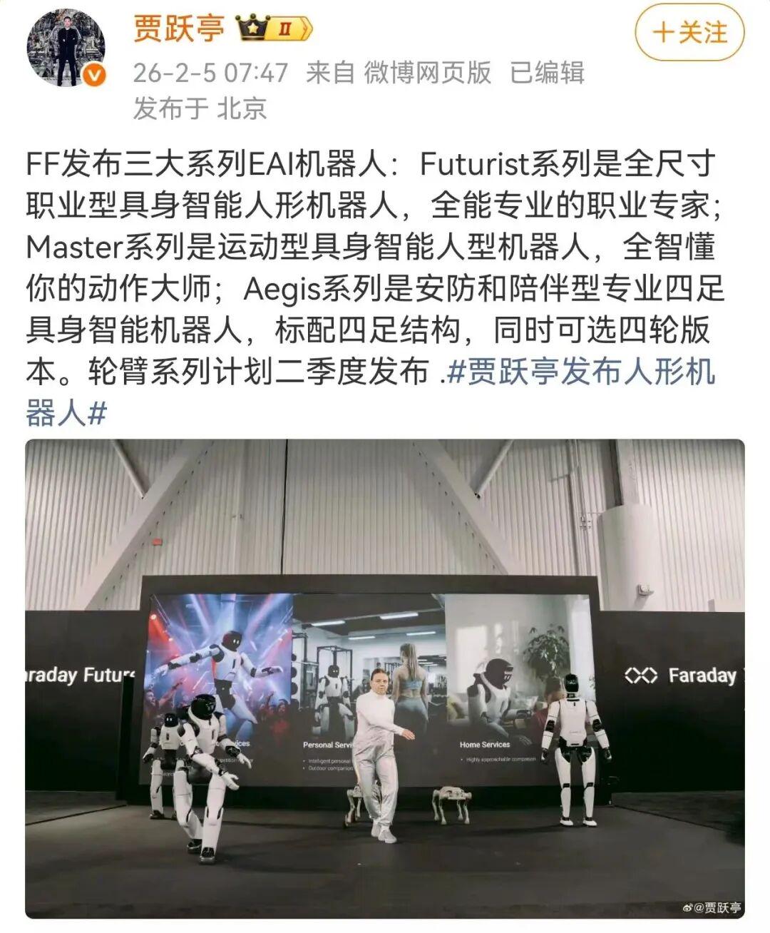 法拉第未来(FF)创始人、合伙人、首席产品及用户生态官,LeEco乐视创始人贾跃亭在平台发文表示:FF发布三大系列EAI机器人,Futurist系列是全尺寸职业型具身智能人形机器人,全能专业的职业专家;Master系列是运动型具身智能人型机器人,全智懂你的动作大师;Aegis系列是安防和陪伴型专业四足具身智能机器人,标配四足结构,同时可选四轮版本。轮臂系列计划二季度发布 。