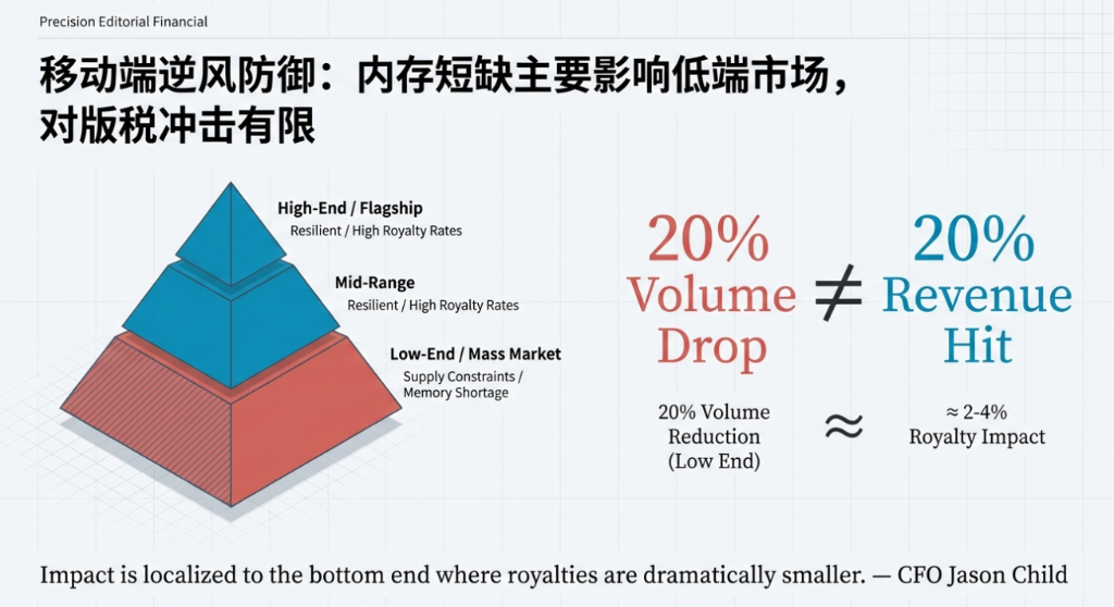 他同时强调,低端产品对应的版税水平更低,因此冲击可控,并给出压力测试: