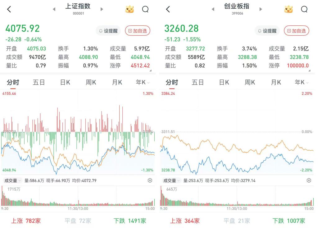 至收盘,上证综指跌0.64%,报4075.92点;科创50指数跌1.44%,报1432.52点;深证成指跌1.44%,报13952.71点;创业板指跌1.55%,报3260.28点。