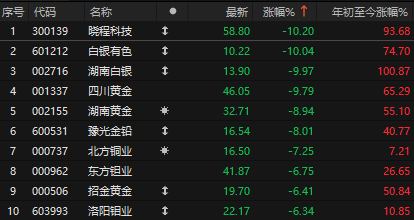受此影响,A股有色金属板块早盘大跳水,白银有色、湖南白银跌停,晓程科技、四川黄金、湖南黄金等多股暴跌。
