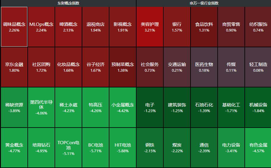 分行业来看,美容护理、银行、食品饮料、商贸零售、纺织服饰等行业领涨,有色金属、电力设备、通信、煤炭等行业领跌。