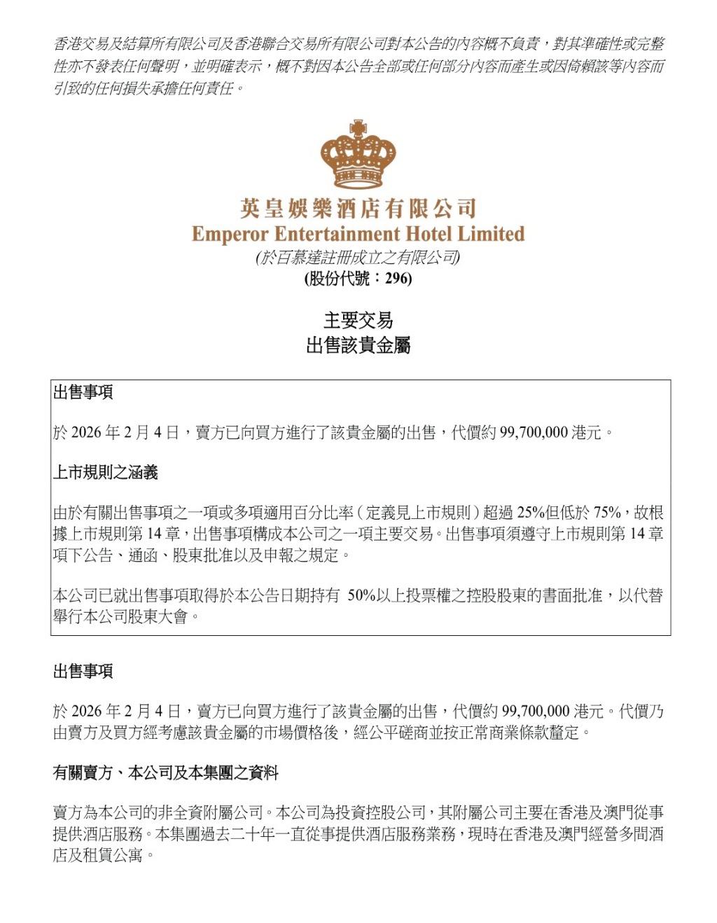 2月4日晚间,英皇娱乐酒店发布公告称,于当日公司的非全资附属公司Right Achieve Limited(正成有限公司)已向买房贺利氏金属香港有限公司进行了该贵金属的出售,代价约9970万港元,而被出售的贵金属为合计重达79公斤的多块金砖。