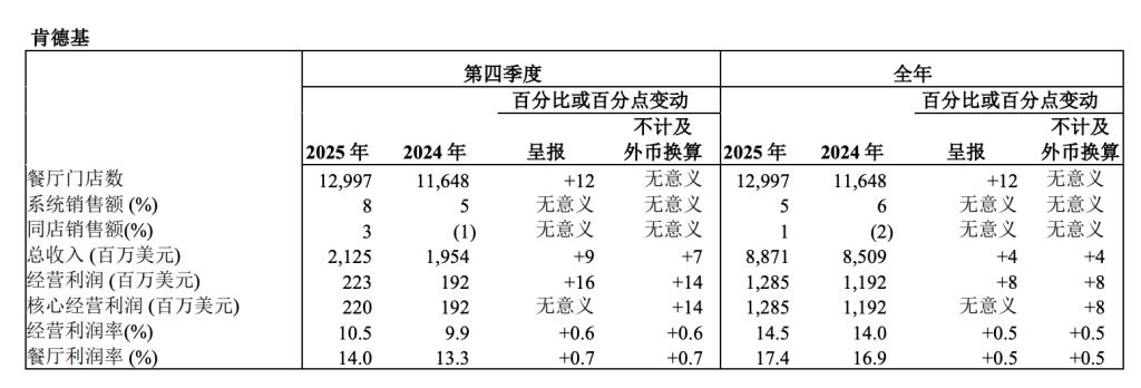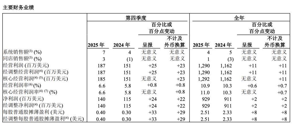 2025年全年,百胜中国总收入同比增长4%至117.97亿美元;经营利润达12.9亿美元,同比增长11%;归母净利润为9.29亿美元,同比增长2%。