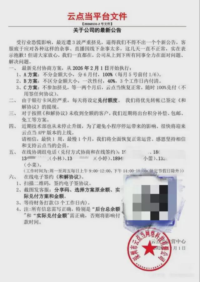 更耐人寻味的是,在推进“三选一”方案的同时,云点当特别强调“暂停代签业务”,并公开提示已有不法分子以“代签、可提高兑付比例”为名实施诈骗。