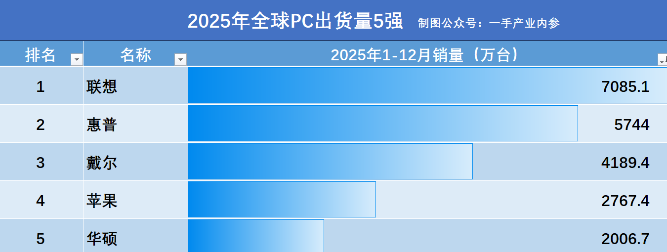 在全球PC行业中,来自中国的联想公司,长期占据着冠军的宝座。2025年1-12月份,联想PC的累计出货量为7085.1万台,一举拿下了25.4%的市场份额。