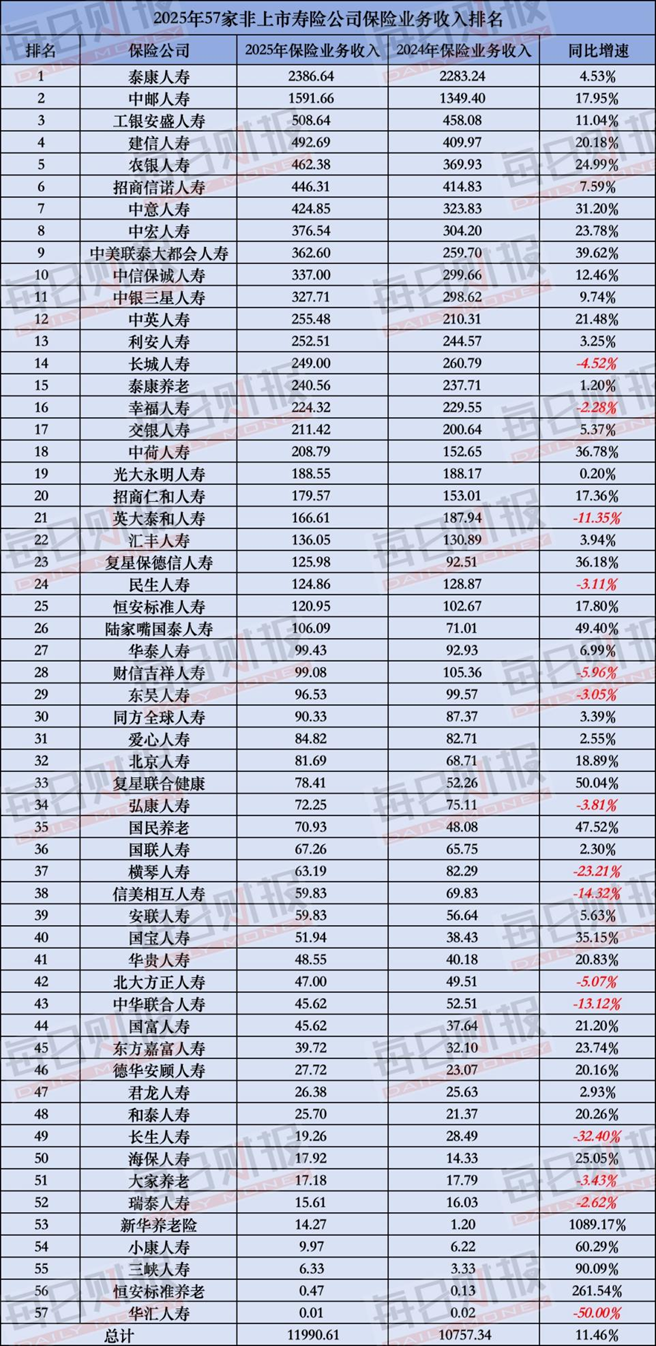 据《每日财报》统计,剔除新旧会计准则切换影响,2025年这57家非上市寿险公司总计取得保险业务收入约1.2万亿元,较2024年的1.08万亿元,同比增长了11.46%;净利润总计666.24亿元,相比2024年的248.98亿元有大幅提升,增速高达167.59%。