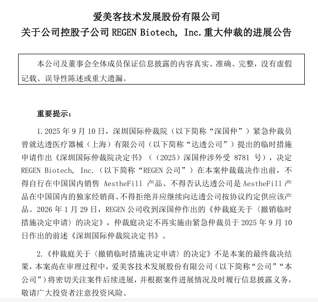 1月30日,爱美客发布公告宣布,子公司REGEN公司收到深圳国际仲裁院作出的《仲裁庭关于〈撤销临时措施决定申请〉的决定》,仲裁庭决定不再实施由紧急仲裁员于2025年9月10日作出的《深圳国际仲裁院决定书》。