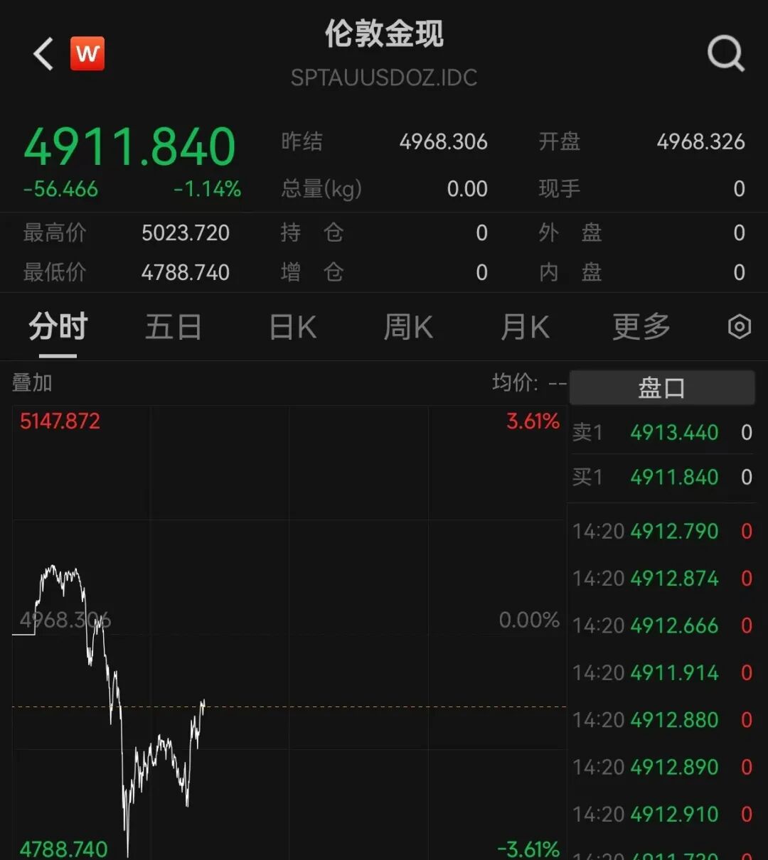 同日,伦敦金现盘中震荡走势,截至发稿报4911.84美元/盎司,跌幅达1.14%。