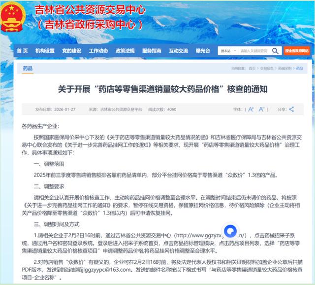 去年12月国家医保局价采中心下发了《关于药店等零售渠道销量较大药品情况的函》,吉林省公共资源交易中心在通知中明确,此次核查工作正是严格依据该文件开展,这份文件虽未公开发布,但在医药行业内广为流传。