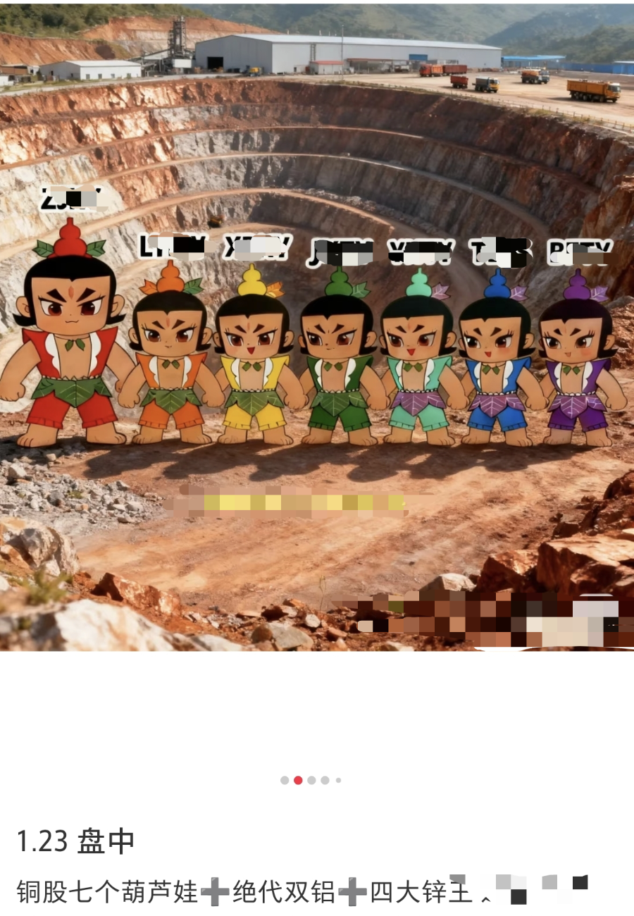 某知识星球590+付费用户的财经“大V”在社交媒体发布的帖子,帖子中提到的“七个葫芦娃”“绝代双铝”“四大锌王”等均为个股或个股组合的代称