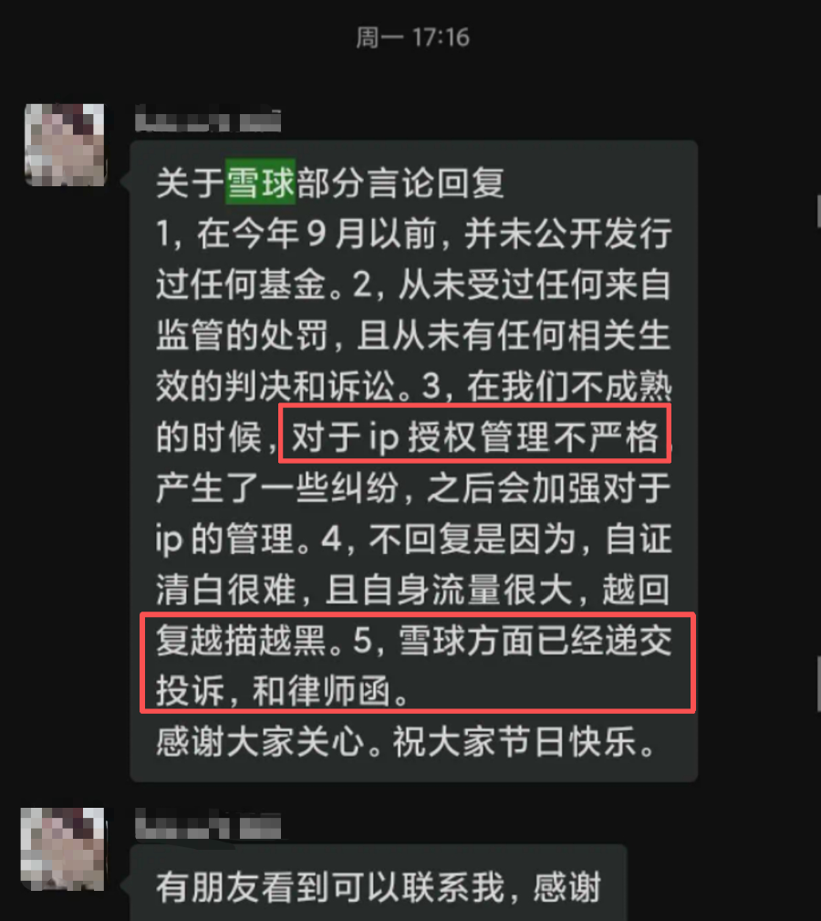 另有其他投资者向记者出示截图显示,上述“大V”账号相关运营人员曾在事件发酵后,在粉丝群中表示“在今年9月以前,并未公开发行过任何基金”,同时该人员还称“在我们不成熟的时候,对于IP授权管理不严格,产生了一些纠纷。”