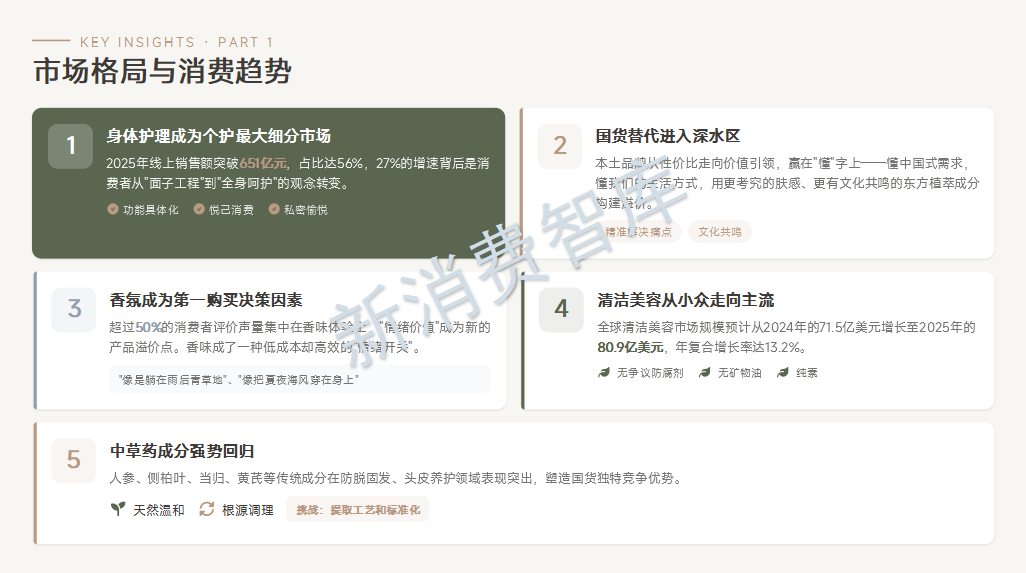 2025年线上销售额突破651亿元,占比达56%,27%的增速背后是消费者从“面子工程”到“全身呵护”的观念转变。以前大家在乎的,是头发要蓬松柔顺,是脸要干净光亮——这些是别人一眼就能看见的“面子”。但现在,很多人开始在乎一些别人不太容易看见的地方:比如夏天穿短袖时胳膊摸起来光不光滑,秋天换季时小腿会不会起白屑,甚至只是单纯追求沐浴后全身皮肤那种放松柔软的触感。