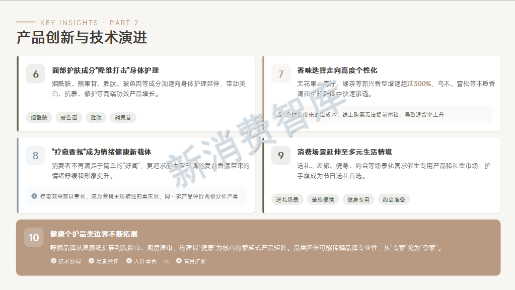 10、健康个护品类边界不断拓展野狮品牌从湿厕纸扩展到洗脸巾、厨房湿巾,构建以“健康”为核心的家族式产品矩阵。品类延伸可能稀释品牌专业性,从“专家”沦为“杂家”。