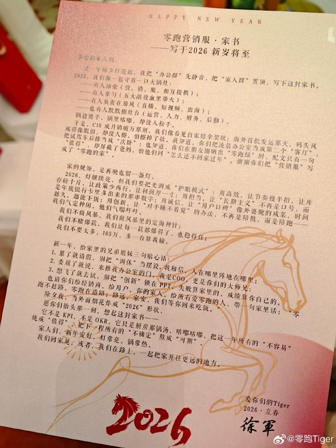 《家书》显示,2026年零跑汽车的经营核心是高效运营、库存轻量化,保持长期主义、盈利可持续,以诚信赢得用户口碑,以创新与同行竞争。