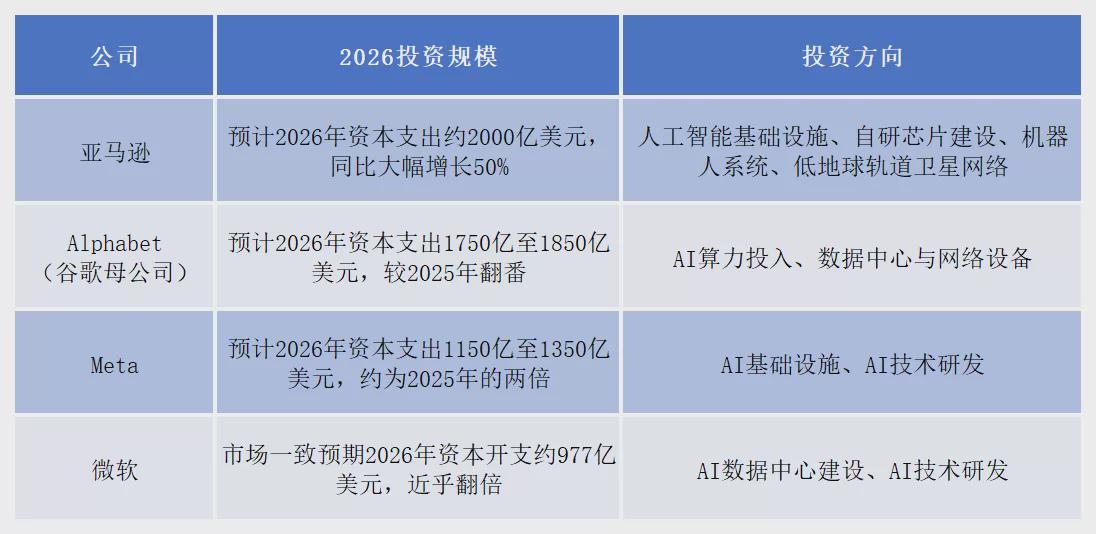 在财报电话会议上,亚马逊宣布了一项惊人的投资计划:预计2026年资本支出(CapEx)将激增至约2000亿美元,同比大幅增长50%,主要用于AI数据中心建设、自研芯片研发及物流基础设施升级。