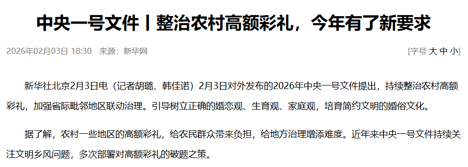 2026年的中央一号文件发布,再次点名天价彩礼。