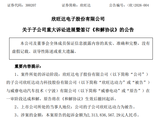红星资本局2月6日消息,今日,欣旺达(300207.SZ)发布公告称,欣旺达的子公司欣旺达动力科技股份有限公司(以下简称“欣旺达动力”)与吉利子公司威睿电动汽车技术(宁波)有限公司(以下简称“威睿”)在一审阶段达成和解,后者将在《和解协议》生效后撤回起诉。