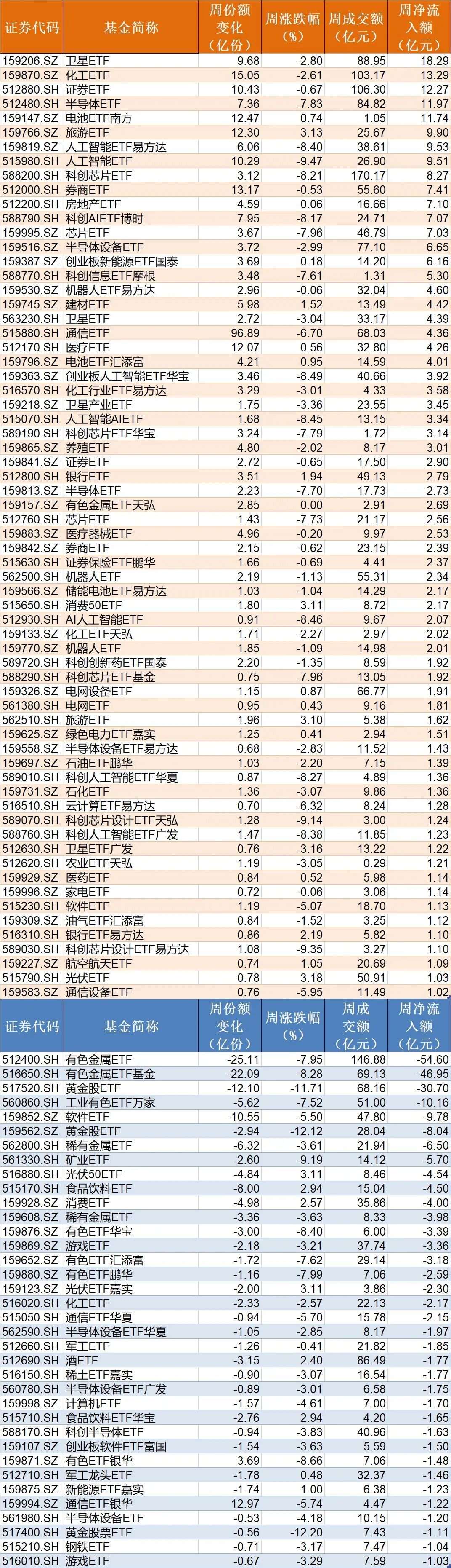 在资金流出方面,本周有36只行业主题ETF净流出逾1亿元,其中有色金属ETF、有色金属ETF基金和黄金股ETF份额分别减少25.11亿份、22.09亿份和12.1亿份,分别净流出资金54.6亿元、46.95亿元和30.7亿元。
