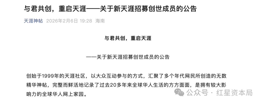 红星资本局2月7日消息,关停近3年后,天涯社区重启迎来新进展。昨日晚间,“新天涯”联合工作组、成都天涯客网络科技有限公司、天涯好东西(海南)电子商务有限公司联合公告,正推进天涯社区于2026年6月1日恢复访问。