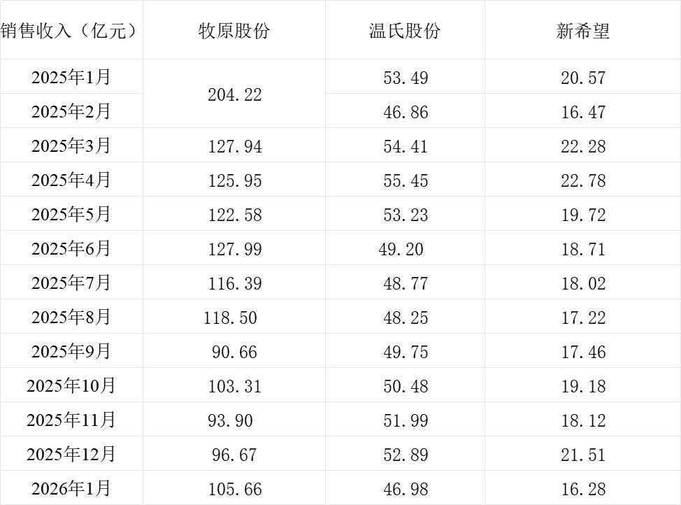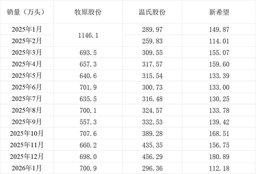 三大上市猪企牧原股份(002714.SZ)、新希望(000876.SZ)、温氏股份(300498.SZ)近日发布2026年1月生猪销售情况。