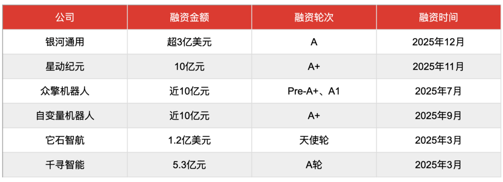 2025年具身智能赛道大额融资纪录