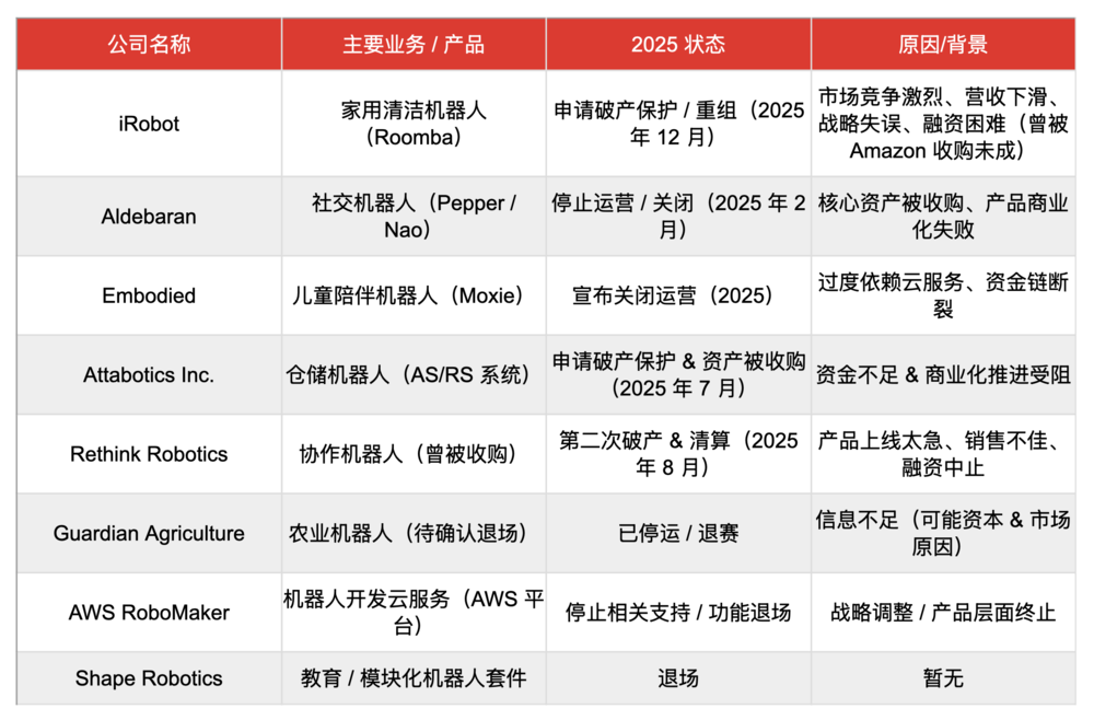这一年里,多个细分赛道的机器人公司相继倒闭或退出市场:既包括消费机器人领域的老牌公司 iRobot,也包括陪伴机器人、协作机器人、仓储机器人等方向的创业企业。一些公司选择申请破产保护,一些被迫清算资产,还有一些则在融资中断后悄然停运。
