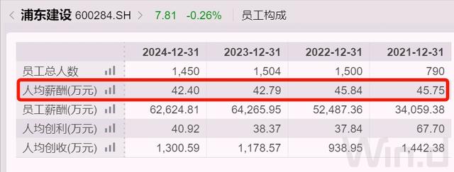 根据万得大数据,2024年,浦东建设职工总数不到1500人,当年人均创利约41万元,人均税前薪酬超过42万元,连续多年保持在40万元以上。