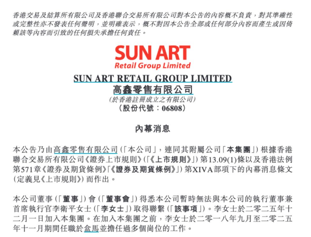 春节脚步越来越近,零售业进入年货备战的冲刺阶段,线上线下红火一片,各大商超货架满满、促销火热,全力争夺春节消费市场。然而,商超界一片忙碌之中,行业巨头大润发母公司高鑫零售(6808.HK)一则公告引发市场哗然:公司无法与上任仅两个月的执行董事兼首席执行官李卫平取得联系。