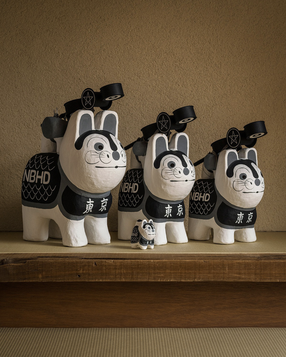 为了打通老玩具和新时代消费审美的区隔,当地的品牌和艺术家也利用新的时尚语境来诠释这些老玩具,远的不说,今年NBHD就跟伊势辰犬张子合作打造了日式传统摆件,卖疯了。
