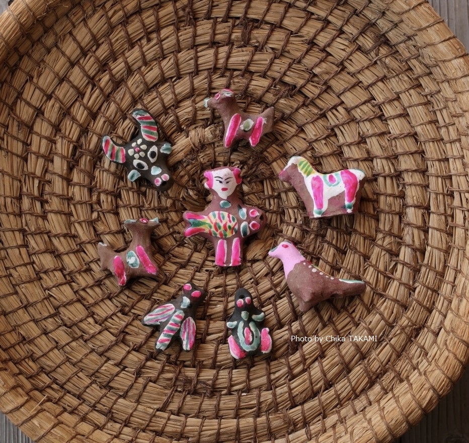 它的制作工艺是拿当地红黏土手捏成型,用刮刀抹平接缝,放个一礼拜晾干,然后送进900度的窑炉后烧制成型。