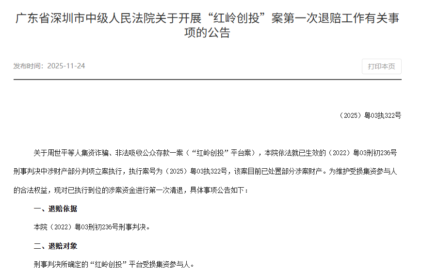 红星资本局注意到,2025年11月24日,深圳市中级人民法院发布公告,正式启动“红岭创投”案首次资金清退工作。此次退赔将发放已执行到位的10亿元资金,范围为经司法确认的受损集资参与人,信息采集时间为即日起至2025年12月26日,计划于2026年1月16日起发放款项。