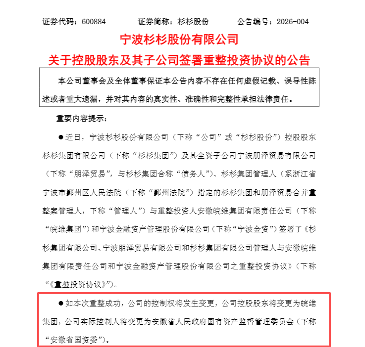 2026年2月6日,杉杉集团、朋泽贸易、管理人与重整投资人皖维集团、宁波金资签署了《重整投资协议》。根据重整投资方案,用于直接收购股票和按上限计算的即期出资股票的破产服务信托优先受益权的投资总额上限不超过约71.56亿元。