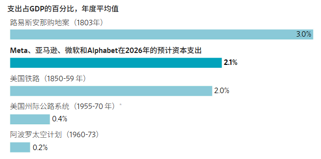 从占美国GDP比例来看,这一规模已经超过了上世纪60年代的“阿波罗登月计划”和70年代的“州际高速公路系统”,仅次于1803年的“路易斯安那购地案”。仅亚马逊一家,就计划今年将资本支出增加近60%至2000亿美元。