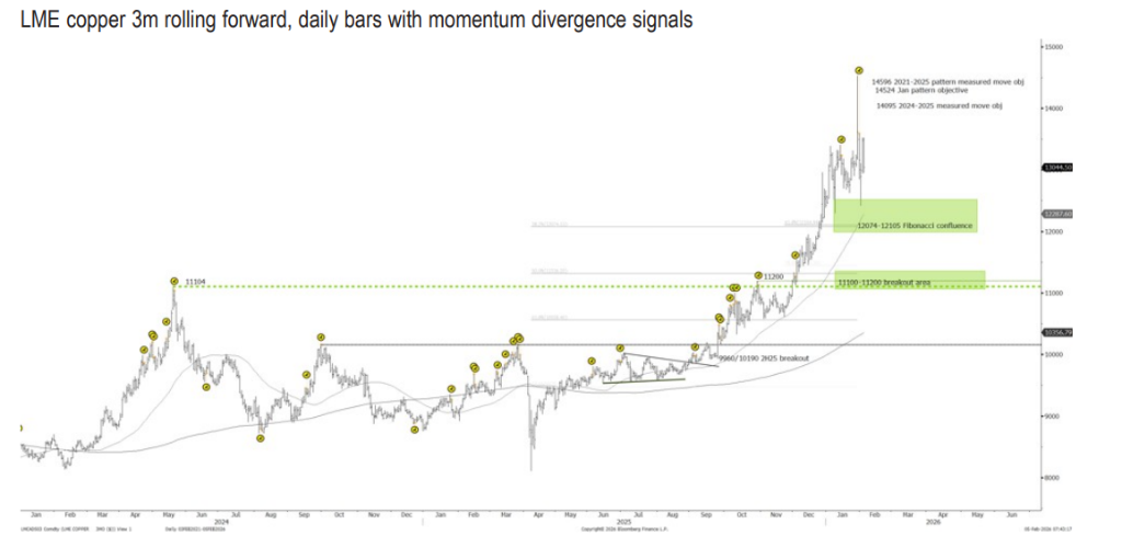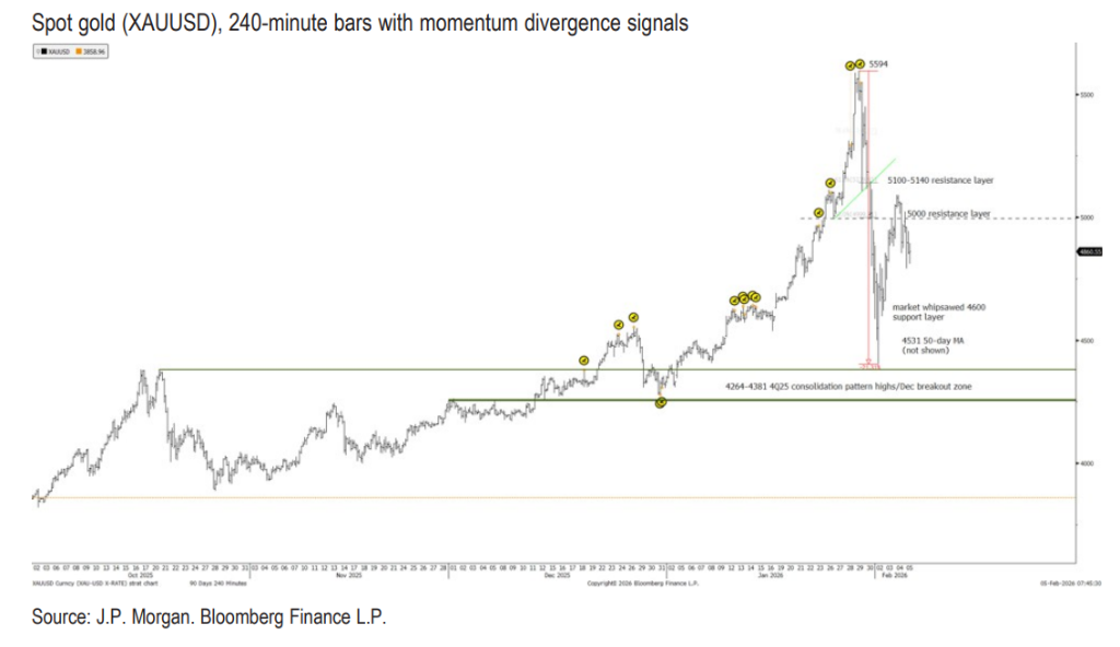 在经历了数月的单边上扬与狂热追逐后,全球金属市场似乎撞上了“天花板”。面对近期价格的剧烈波动,华尔街顶级投行摩根大通(J.P. Morgan)在2月5日发布的技术策略报告中发出明确信号:金、银、铜等主要金属品种在未来几周都将进入“盘整期”。