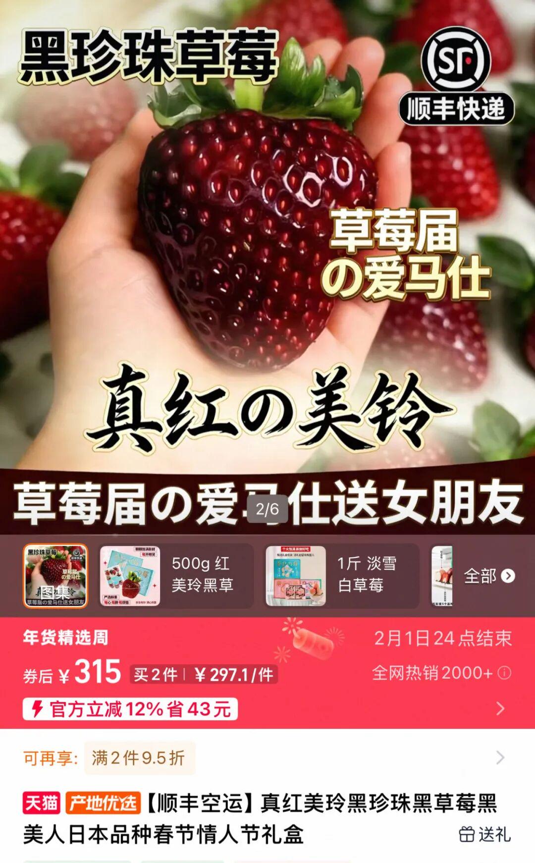 网购平台上,某标价315元/500g的黑草莓,显示“全网已热销2000+”。